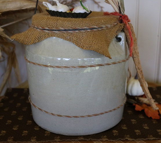 An old tart tin filled with pearl onions, early peas, corn kernels along with wee pumpkins adorn the top. Perfect for your buttery / root cellar or pantry displayed on an open shelf with other pieces of stoneware, old bowls or even baskets filled with root vegetables. Enjoy!