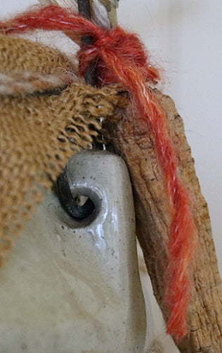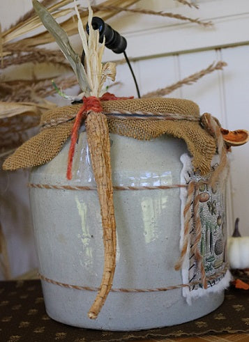 🥕 Vintage crock with bail handle takes on a new appearance with a burlap cover along with a botanical “Root Vegetable” label that has been reproduced backed in fluffy cotton. Label has been hand stitched and secured by wispy thread. A dried parsnip hangs to the left wrapped in orange yarn attached to the wire.