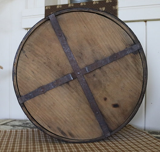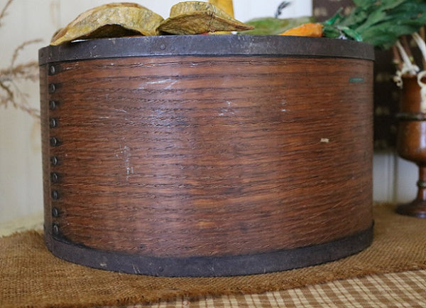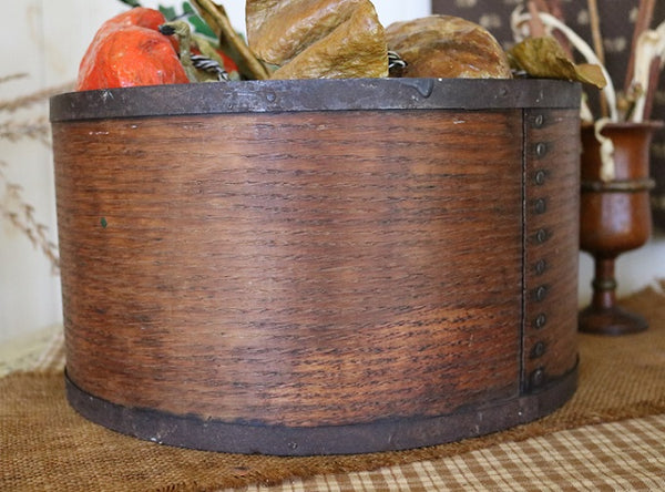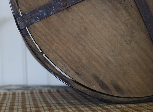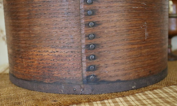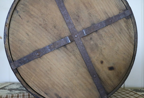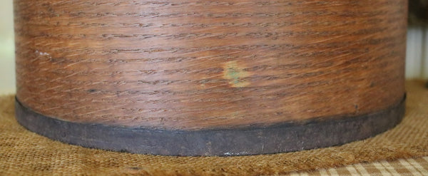 Dry measure was fashioned from oak and the graining is quite fabulous. There are some areas showing green paint on the back location along with a lighter spot near the bottom dotted with a faint green mark. White marks can also be found on the left side as shown. The inside bottom has areas of dark staining lending a circular pattern.