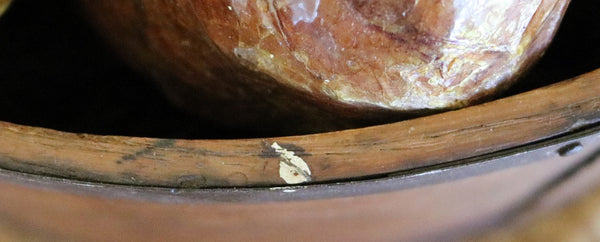 Slight separation has occurred referring to the bottom section that no longer is a tight fit for the side walls. There are no chips or cracks to report and the rich patina is outstanding.