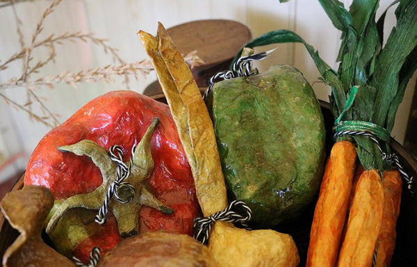 🍅🥕The harvest was brought in and behold the rich blessings from the earth that will be stored in the root cellar offering substance for the lean winter months ahead. But in this case these unique vintage papier Mache folk art vegetables make a nice display inside a 1800 ~1840 measure lending striking color and interest. You will receive six handcrafted vegetables including a tomato, radish, onion, green pepper, turnip along with five carrots tied at the top….. all accented with nifty white and black ties.
