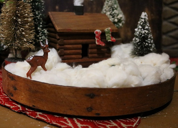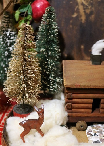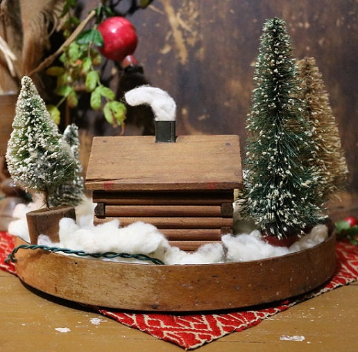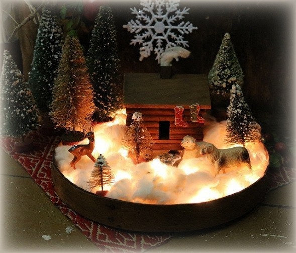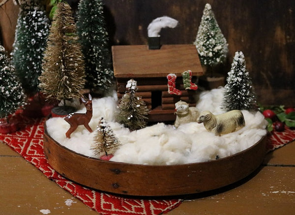 The scene I created with the inspiration of a 19th century pantry box lid filled with fluffy, raw cotton simulating snow with a cabin in the woods is a one of a kind piece and can certainly entertain not only you but your guests. The snow lights up by way of mini lights placed underneath that can be plugged into any receptacle. Old bottle brush trees give way to an enchanting forest while the animals dot the landscape lending whimsy.