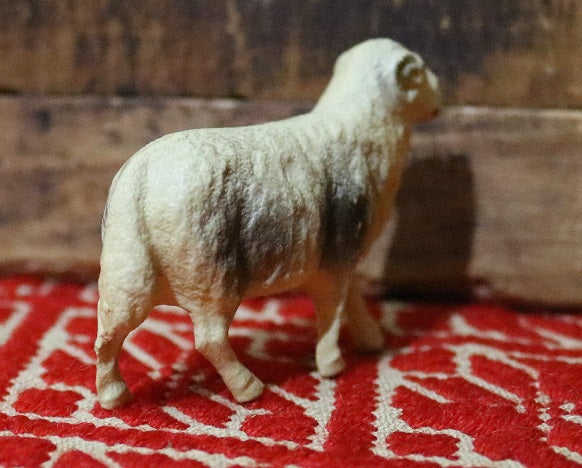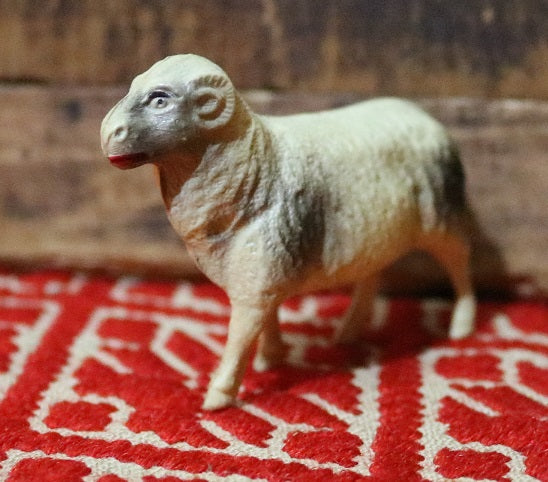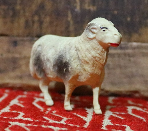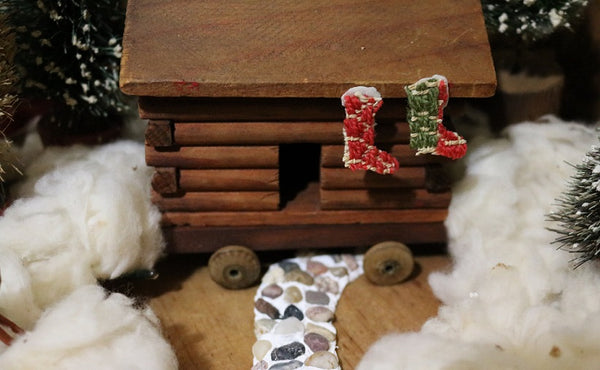 One sheep is of the Putz German variety while the other is a Viscoloid ram dating to around “1920 1940”. The little fawn is vintage and shows nice detail. A meandering path fashioned from tiny stones I created adds texture and realism to the overall look. The vintage cabin (once used as an incense burner) sporting a tin chimney is raised on a wooden pull toy platform equipped with old wheels. The roof on the cabin has a sliver of wood missing as shown near the back edge.