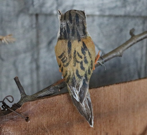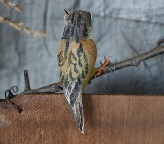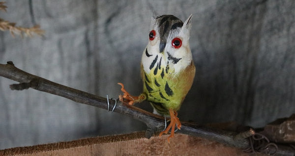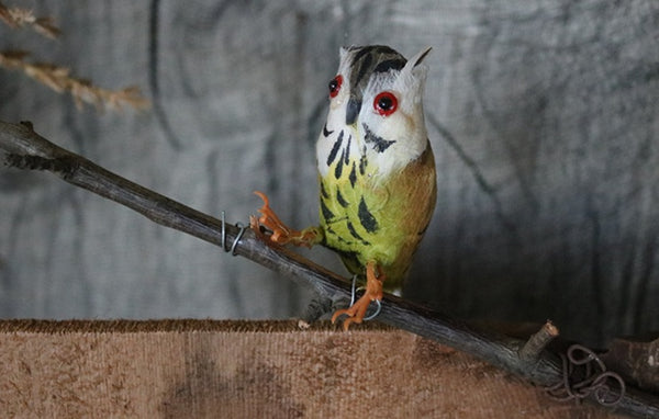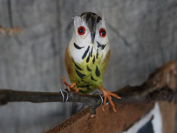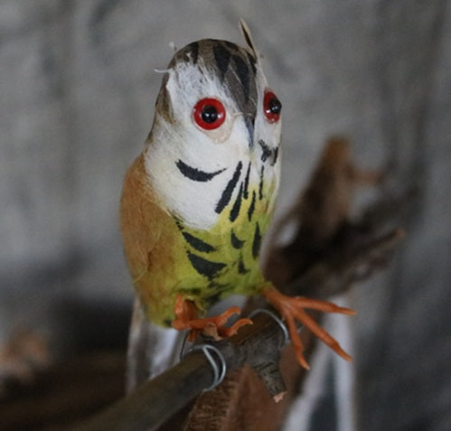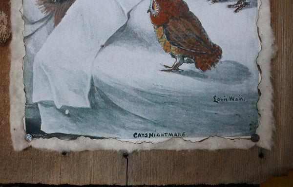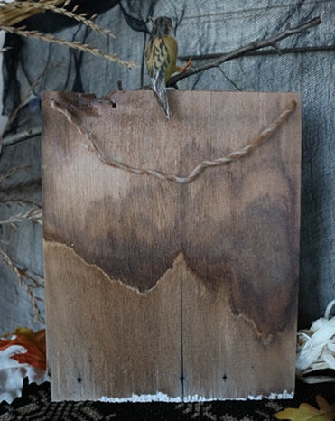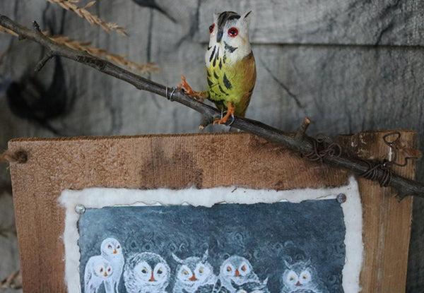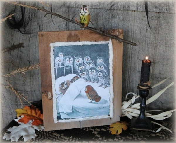 This piece was backed in cotton batting and laid on an old shingle using four tacks to secure it. There are age related cracks in the shingle along with several chips on the edge. A branch was added at the top suggesting a rustic outdoor appearance where a vintage spun cotton and hand painted owl rests and acts as the keeper for the owl menagerie below. The upper dark background of the painting shows more owls that seemingly fade in the distance offering a suggestion there are many more behind them. I attached variegated string so this piece can be hung.