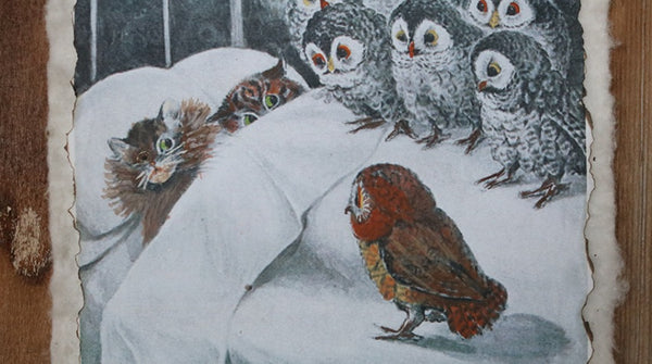 The artist “Louis Wain” captured a laughable scene in his watercolor painting depicting an onslaught of owls peering at two cats that just awoke from slumber in their cozy beds. This black and white painting was reproduced but I painted in color to accent the main focal points.