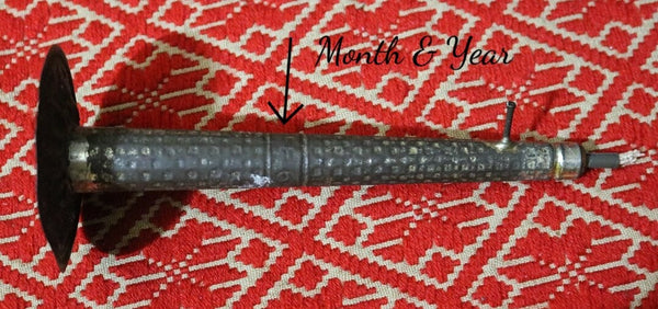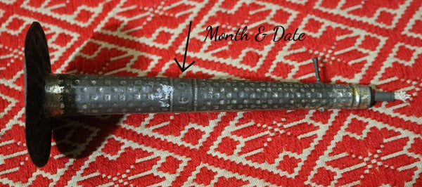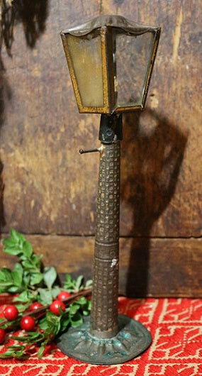Fallows tin Christmas Lamp Post showing a patent date of Apr 6th 1897 (marked on center shaft) as shown. This unique street lamp is a perfect accessory for a small toy saltbox house as it creates a charming look mimicking the New England style lamp posts that were once placed in front yards.