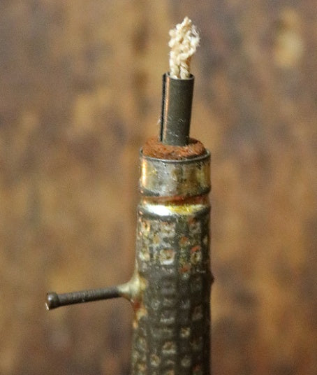 Top lantern showing a vent hole is removeable from shaft and still retains the original wick. Base and top showing a raised design with vestiges of green paint limited to the bottom. Slight surface rust. Lantern having canted sides is in good overall condition without any dents to report.