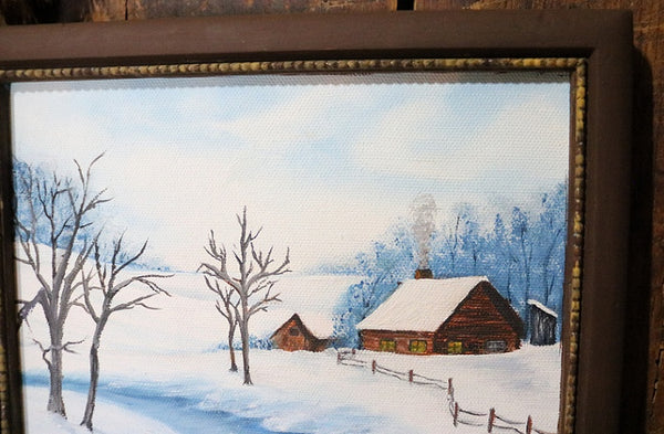 Tranquil vintage oil painting depicting a cabin in the woods out in the country laden with fresh fallen snow is a peaceful scene that seems to resonate with our quiet side. The residents are cozy inside referencing the soft glow cast from the windows and are enjoying the warmth of a fire as shown by the smoke escaping from the chimney. A creek now frozen over seems to hold the water captive until the promise of spring.