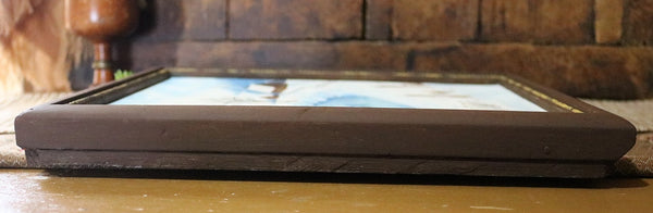 I painted the frame as there was minor loss (as shown) on the “hobnail” raised section that acts as a border near the edge. This section was intentionally painted a light mustard color to offset the nutmeg ground and adds dimension to the overall appearance. Paint has not been sealed and shows a flat matte rustic surface. Great smaller size that can be leaned up against a table or worked into a cupboard.