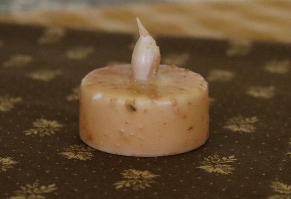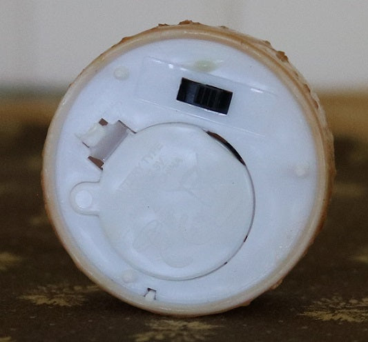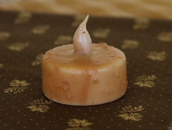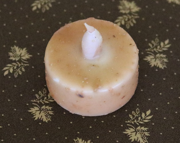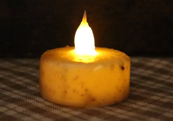 A primitive tea light that sports a wax surface lending tiny brown specks was placed inside, on top of nutmeg brown excelsior. There is no timer but rather an "on & off" switch.  This tea light softly flickers and offers exciting enchantment wherever it is placed.