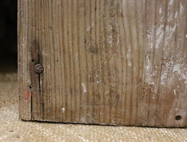 This wall box is heavy and extremely sturdy. It dates to around 1920 to 1940’s period. The canted front lends character as well as the decorative “V” cut out directly in the middle. Whispers of pale red paint can be found in a couple areas on the back edges limited to the right hand side. There are also indications of a half-moon circle done in pencil on that back but is hard to detect.
