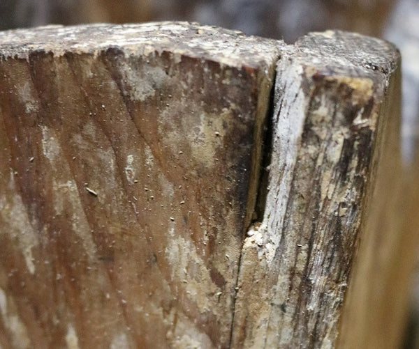Wood loss by way of a vertical chip (1 ¼”) is present on the right hand side near the top. Several small chips are located on the bottom edges at random. One lone age crack is can be found on the bottom as shown. Lastly, the back has a slight warping on the right hand side near the bottom location but is hard to see and does not affect the appearance in the standing position.