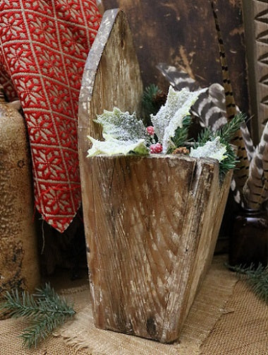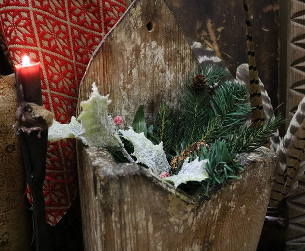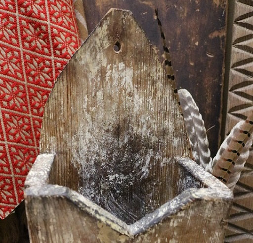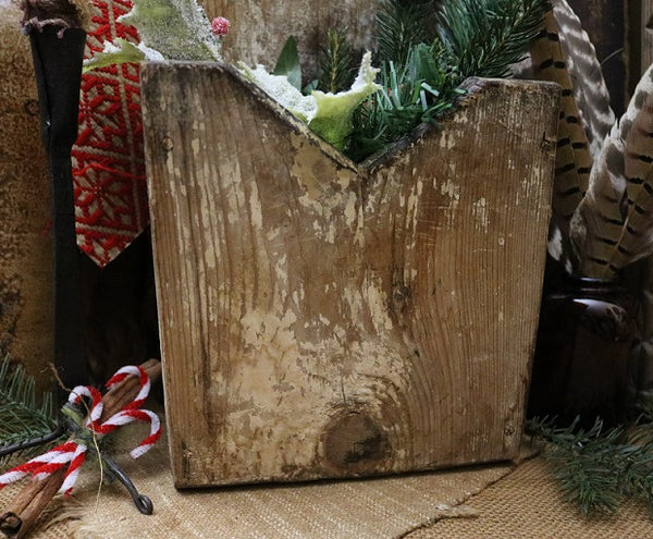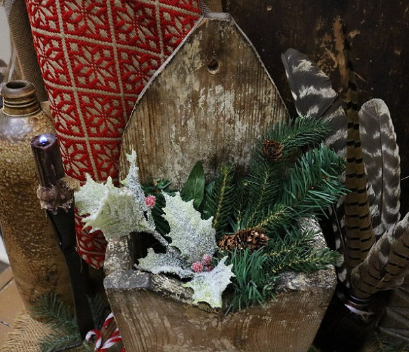 Overall the condition is good and this piece is structurally sound. An array of artificial greens and pine cones along with snow tipped holly leaves accented with red berries are quaintly nestled in the open pocket. This addition adds plenty of festive cheer for the holidays! They can be replaced with either rag balls, old wooden paddles, spoons and butter stamps for a nice kitchen display or can be filled with miniature washboards and early clothespins for a laundry room setting. I am sure you will have fun decorating this special wall box for the seasons that lie ahead. Enjoy!