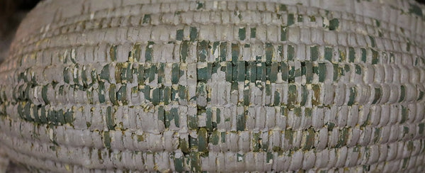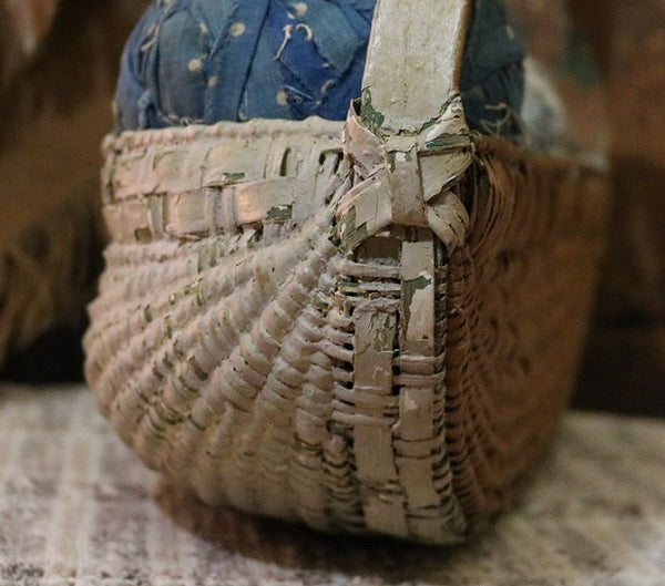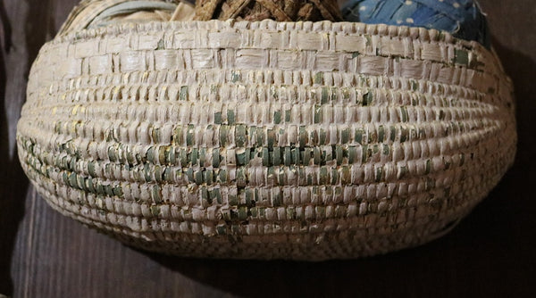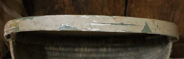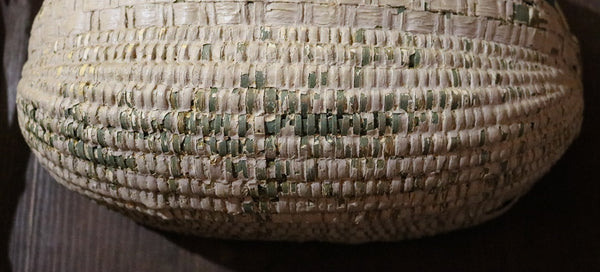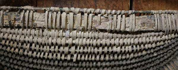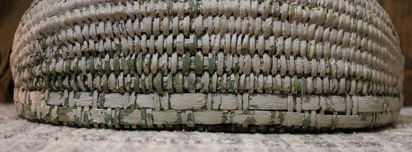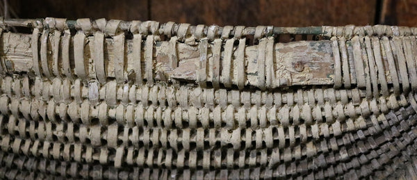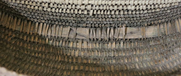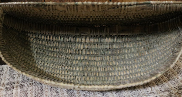 Double woven bands appear in the front followed by tighter and more intricated weaving just below. Bentwood handle is terminated by “Gods eye” ends on each side. Loss of weavers located on the inside bottom (handle) and top back areas as well as on the sides. However, the intricate weavers on the front, bottom and back locations are intact.