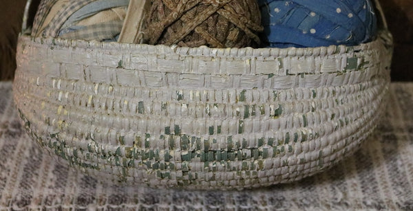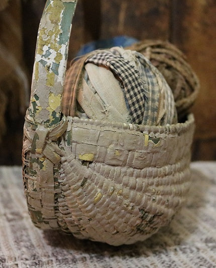 19th century wall basket showing thick layers of paint having a flat back filled with flowers also included will brighten up your home lending springtime charm. Somewhat chippy surface with a primary color of oyster along with vestiges of apple green paint. Back color comprised of a solid golden tan while the inside bottom lacks paint.